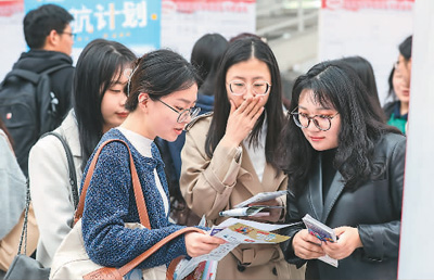 日前,江苏省2024年春季促就业攻坚行动省级系列招聘会淮安地区专场举行,来自省内外的220家用人单位,提供涵盖教育、金融、信息、新能源、新材料等领域近1万个就业岗位,吸引2000余名高校毕业生现场咨询应聘。图为高校毕业生在招聘会上了解岗位信息。